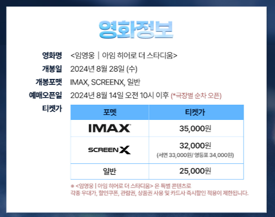 티켓 가격 : IMAX 35,000원 / SCREENX 32,000원 [서면 33,000원/영등포 34,000원] / 일반 25,000원